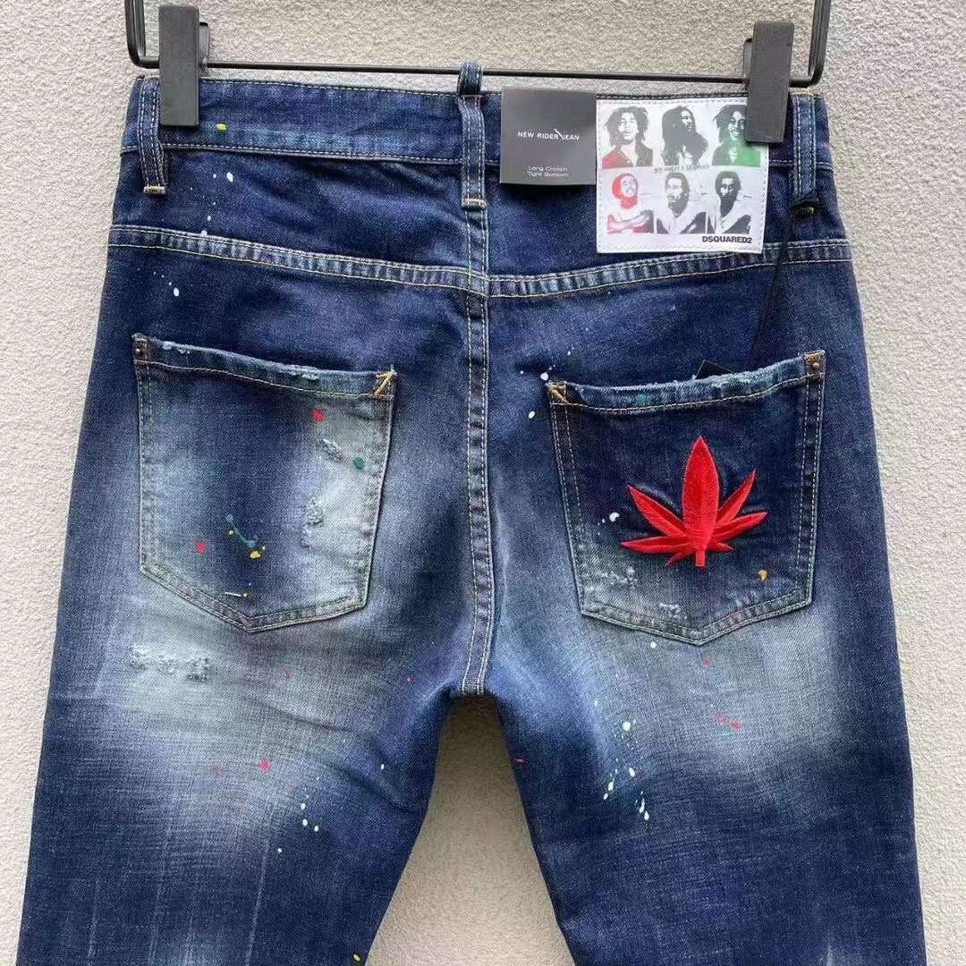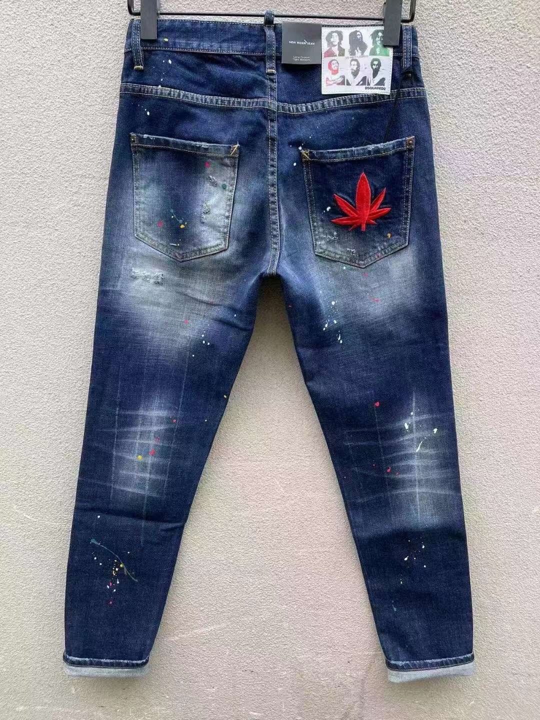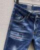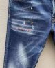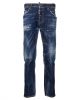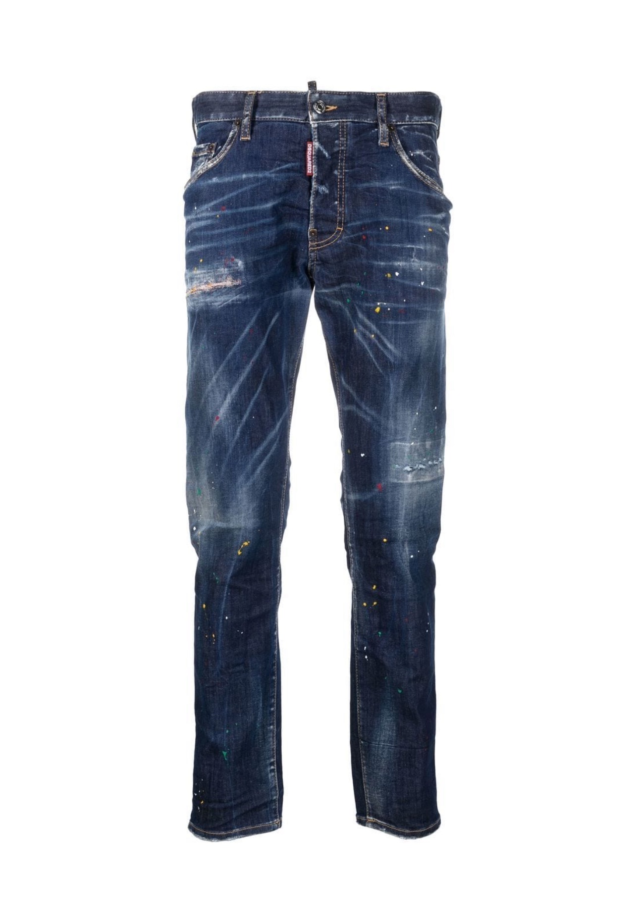 paint-splatter slim-cut jeans from DSQUARED2 featuring navy blue, stretch-cotton, washed denim, whiskering effect, paint splatter detail, slim cut, front button and zip fastening and classic five pockets.