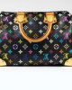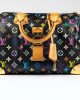 Keep your look colorful yet sleek with this multi-color monogram canvas speedy 30 by Louis Vuitton. Made from black coated canvas with colorful silk-screen printed LV monogram, created by Japanese artist Takashi Murakami, it also features smooth beige vachetta leather trim. This satchel is also accented with edgy gold-tone studs, gold metal corners, a front buckled pocket, two gold keys and rolled leather handles. Its suede lined interior is open and ideal for carrying everyday essentials.