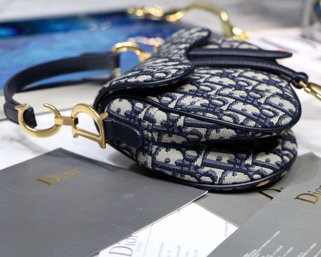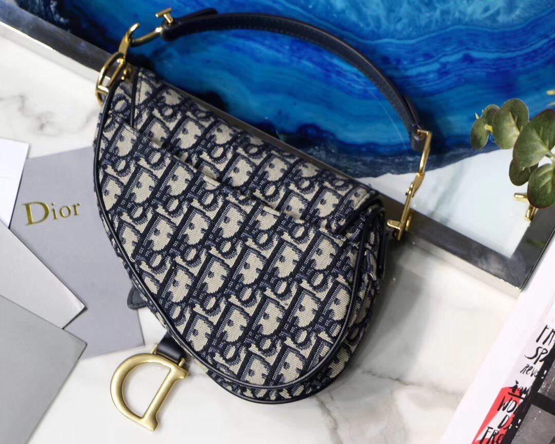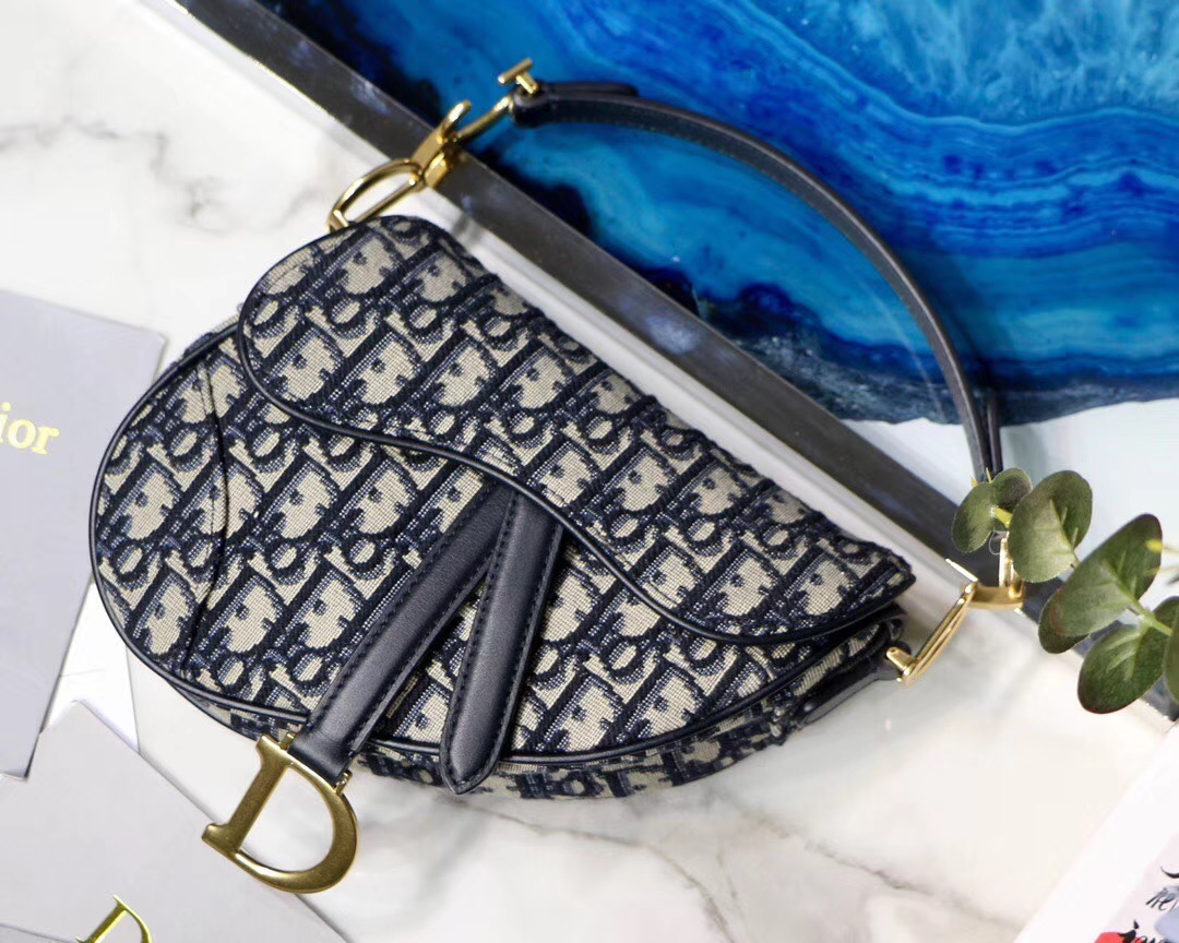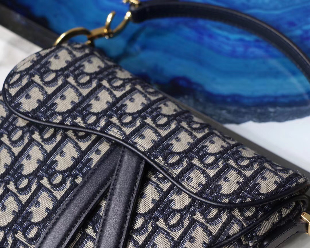 Maria Grazia Chiuri brings a fresh update to the iconic Saddle bag. The heritage design showcases the emblematic ‘D’-stirrup magnetic clasp and Saddle flap with the signature ‘CD’ structure on both sides of the handle. The fully embroidered blue Dior Oblique jacquard features antique gold-finish metal hardware and the ‘Christian Dior’ signature on the front. The modern silhouette may be customized with alternative straps.